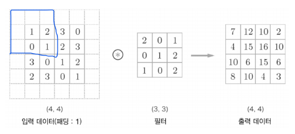 합성곱 연산 전에 입력 데이터 주변을 특정 값으로 채우는 것으로 출력 크기를 조정할 목적으로 사용