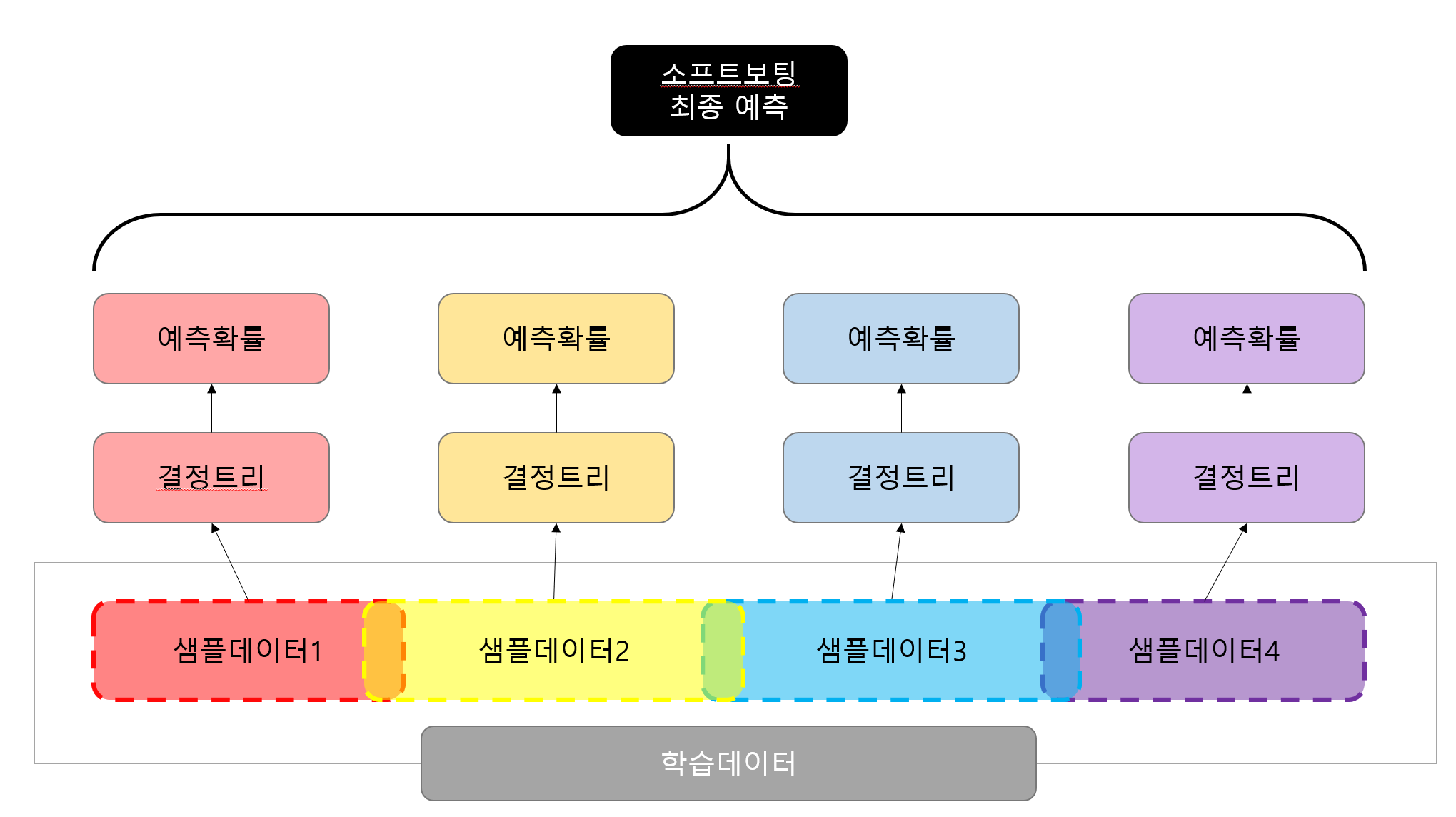 하드보팅은 다수결의 원칙과 비슷해서 다양한 알고리즘이 예측한 값 중 가장 많이 나온 값을 최종 결정한다.
