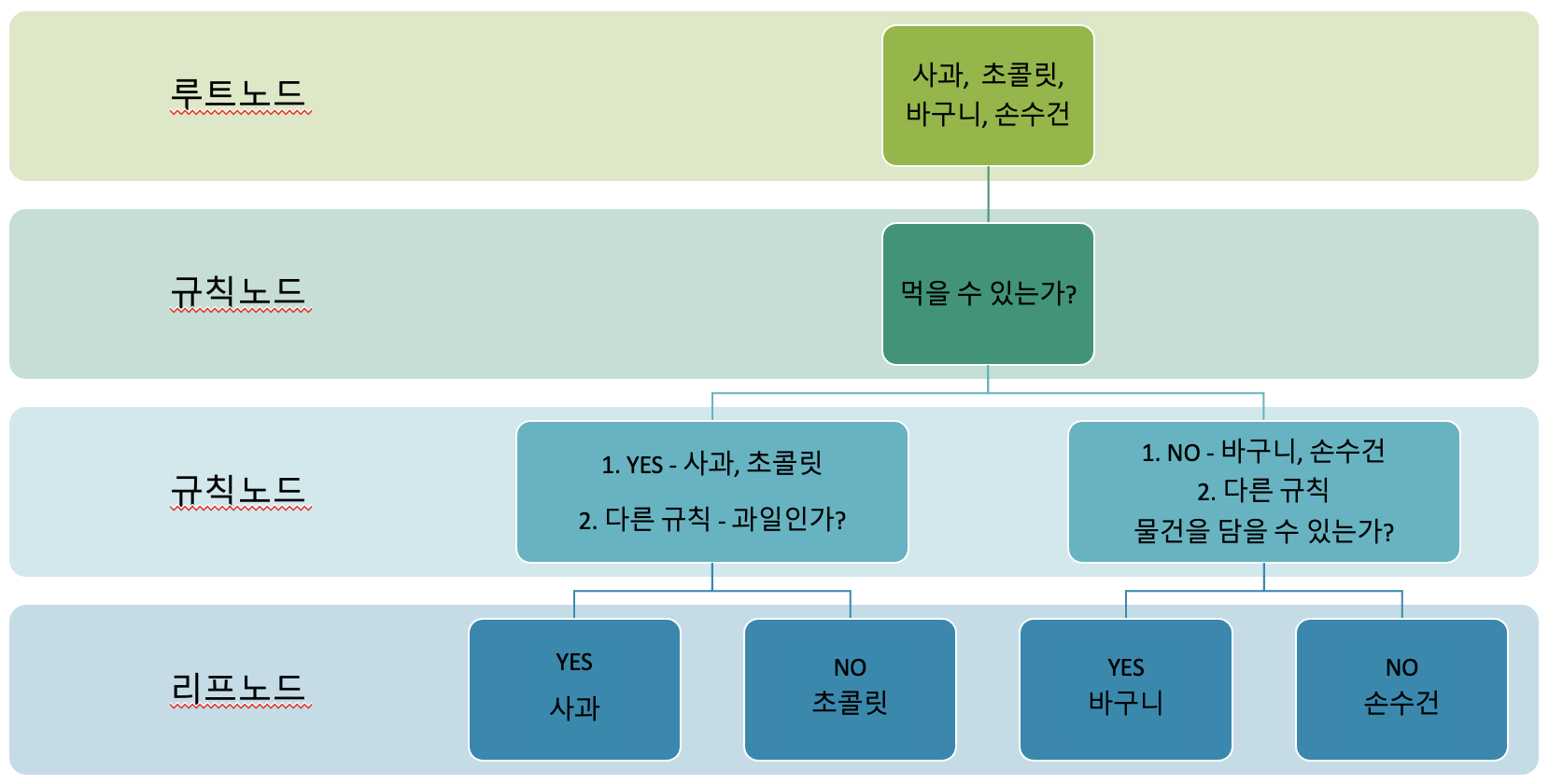 이 그림은 이해를 돕기 위해 간단하게 정리한 것이지 실제로는 각 노드 안에 규칙, 지니계수, 데이터개수 등의 정보가 존재한다.