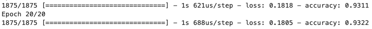 첫번째 두번째에서는 로스도 0.5, 0.37로 그 값이 크고, 정확도는 0.82, 0.86으로 작은 반면 학습을 시킬수록 로그는 떨어지고 정확도는 올라서 마지막 20번째에서는 로스가 0.18, 정확도는 0.93인것을 확인할 수 있다. 더 많은 학습을 시키면 더 좋은 성능을 낼 수 있다.