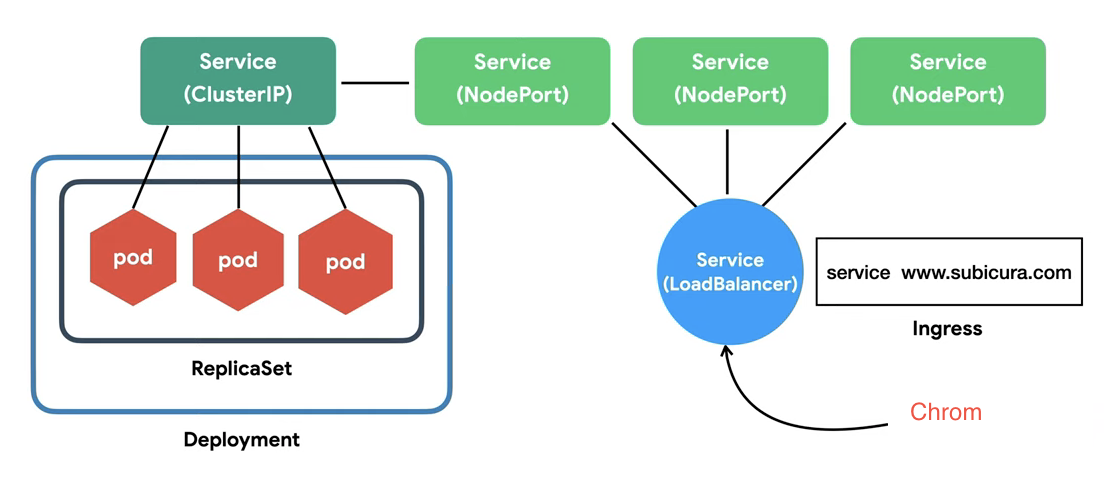 웹브라우저는 노드포트를 통해 클러스터 IP에게 요청사항을 전달, pod에 그 요청사항이 도달한다.