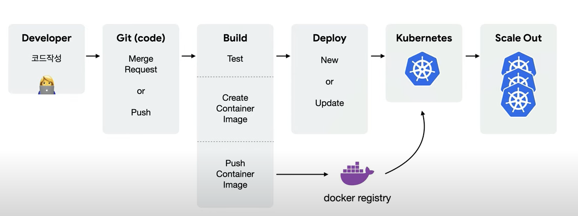 코드 작성 --> 도커 이미지 생성 --> 도커 저장 --> 원하는 환경에서 도커 실행