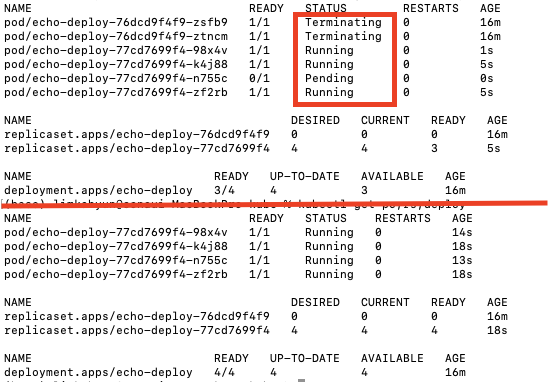 그래서 Status를 보면 Terminating, Pending, Running의 상태를 확인할 수 있다.