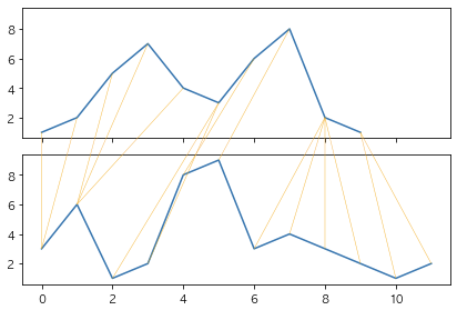 dtwvis.plot_warping(a, b, path = dtw.warping_path(a, b))