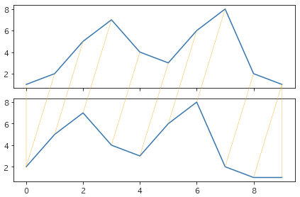 DTW의 경우에는 이 시간인덱스를 감안해서 계산하기 때문에 distance가 1이 나왔다.