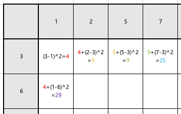 = (a의 두번째 요소 2 - b의 두번째 요소 6)의 제곱 + 인접셀 중 가장 작은 값