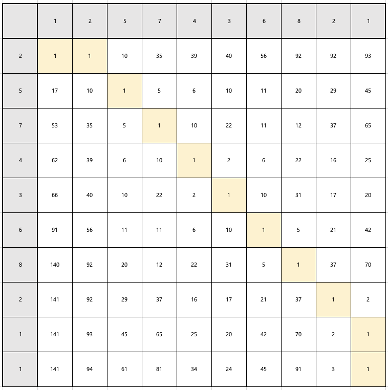 (1, 2) 부터는 이전 셀 + 두번째요소들의 차 로 계산해서 넣어주면 된다.