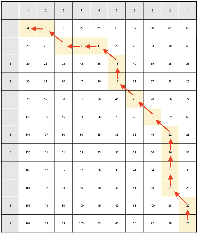 최적의 와핑경로는 마지막 셀에서 작은 숫자로 역추적 하는 방법을 사용한다.
