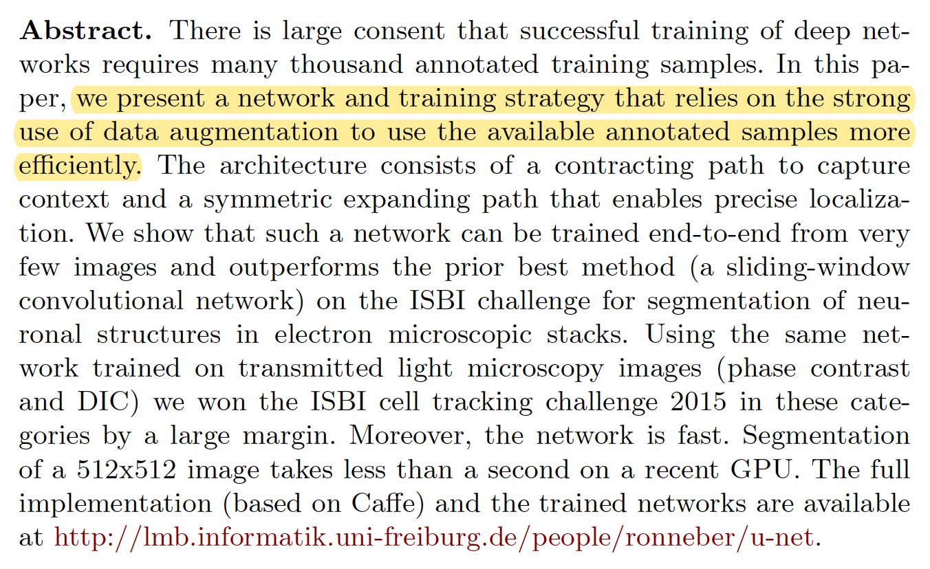부드러운 변형을 통한 데이터 증강 덕분에 annotation이 된 이미지가 많이 없어도 학습이 가능했고,
