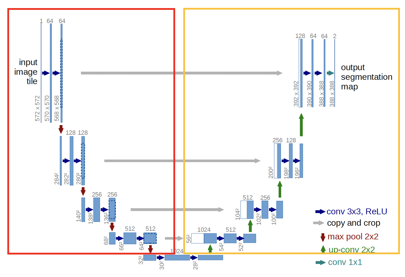 이를 위해서 모델 아키텍처는 contracting path와 expanding path가 대칭을 이루고 있으며, contracting path에서는 특정 context를 캡쳐하는 역할을 하고 expanding path에서는 이 캡쳐본을 정확한 위치에 적용하는 역할을 한다. 이 말은 밑에 UNet의 구조를 그림으로 보면 더 잘 이해할 수 있다.