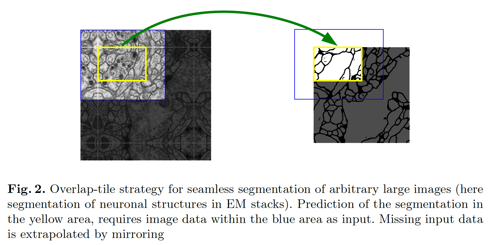 UNet에서는 완전히 연결된 레이어를 사용하는 것이 아니라 각 컨볼루션의 유효한 부분만 사용하여 Fig2와 같이 오버랩 타일 전략으로 segmentation을 예측한다. 오버랩 타일 전략은 GPU 상황에 따른 해상도 제한 없이 큰 이미지에도 모델을 적용하기 위해서 사용된다.
